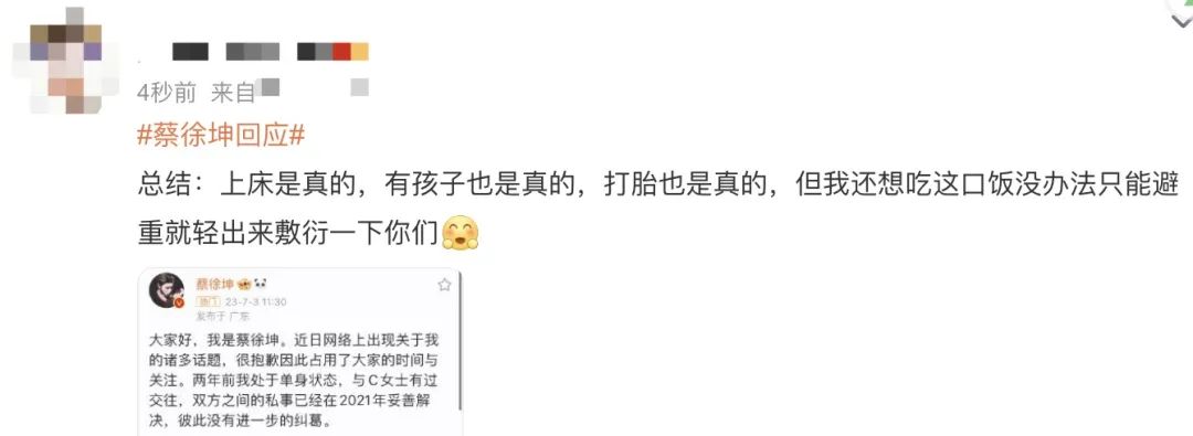 蔡徐坤回应后约一个小时左右,又一情人被曝光。蔡徐坤这次的反应跟前一位不同,光速做出回应。