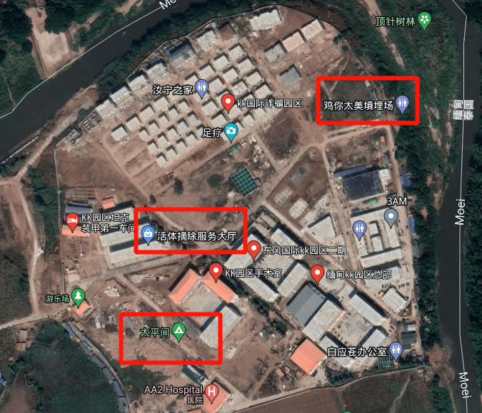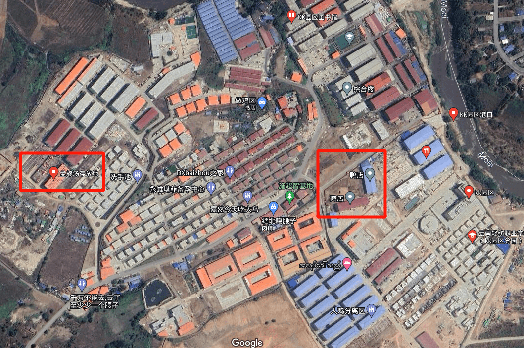 其中,妙瓦底的KK园区最为出名,谷歌地图的实况地图清楚地标注了园区内部的构造。