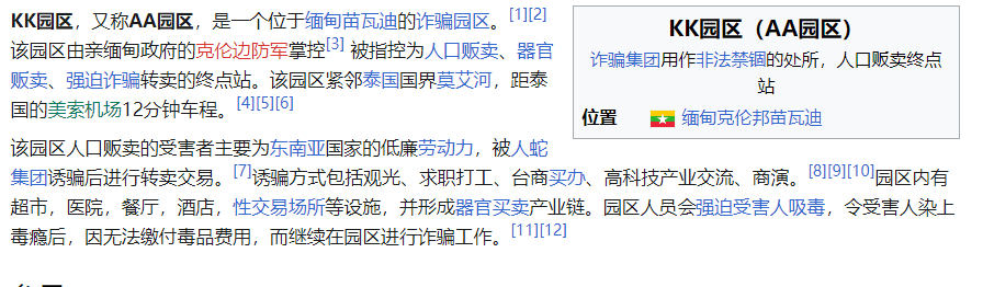 维基百科标注:KK园区,非法禁锢的住所,人口贩卖的终点站!