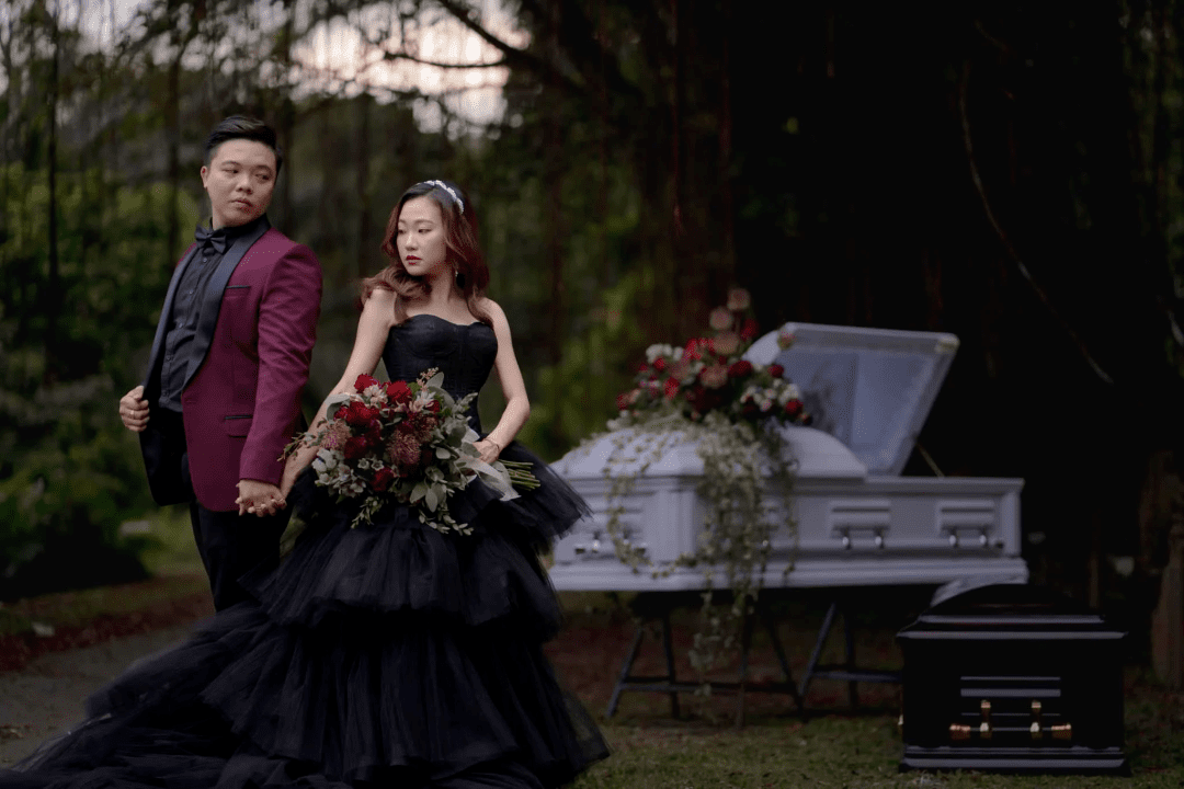 据悉,这对新人在新加坡从事殡葬业工作。二人因工作相识相爱,也经常去墓地做事,因此决定打破禁忌来一场不一样的婚礼。