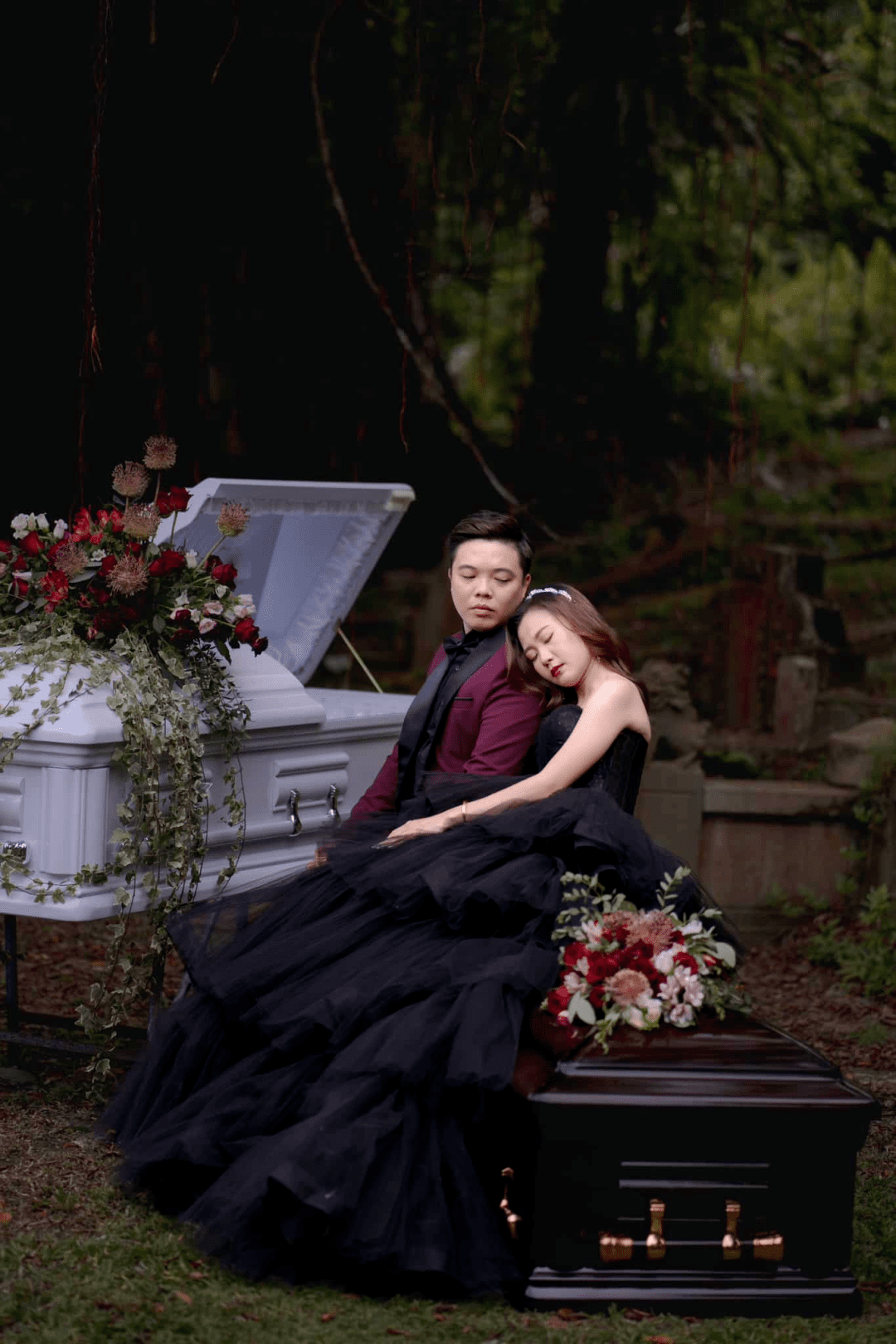 照片中的二人穿着黑色衣服,并用棺材作为拍摄道具。在拍摄前,二人表示还特意向周围的坟墓祈祷,以表达对死者的尊重。