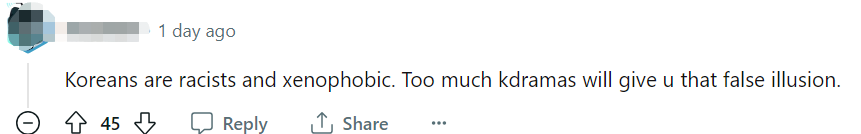 “韩国人是种族主义者和仇外者。只是(我们看过的)很多韩剧给了我们一种错觉。”