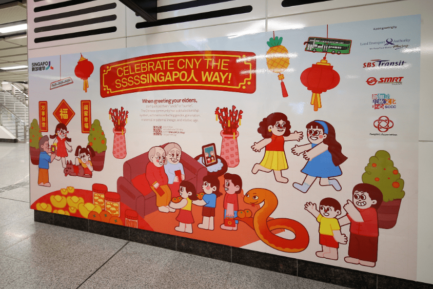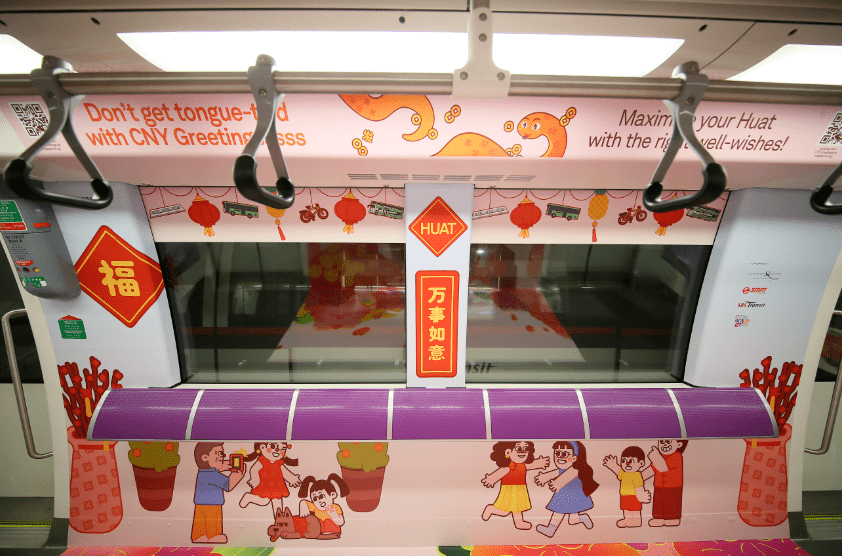 新加坡的不少地铁和巴士已经早早换上到了春节的“蛇装”,车厢内贴上了“新年快乐”字样的长幅,也挂上了红色的“福”和“合家欢乐”的春联。