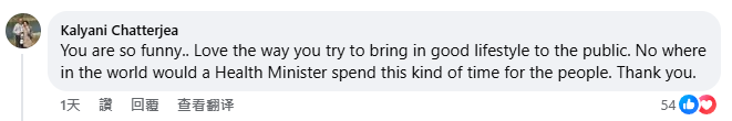 “你太有趣了,喜欢你想要让国民健康生活的传达方式!世界上没有哪个卫生部长会为了自己的国民这么用心!谢谢您!”