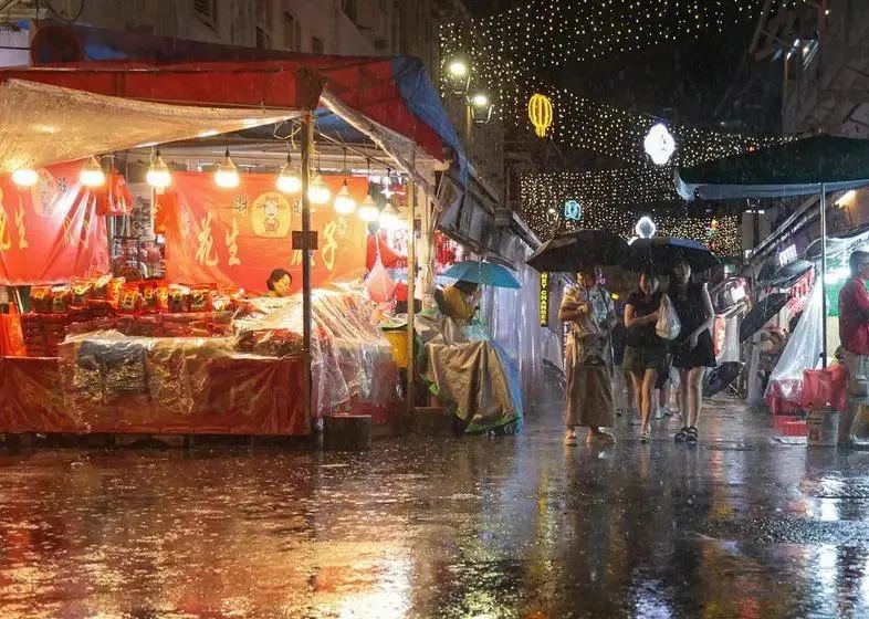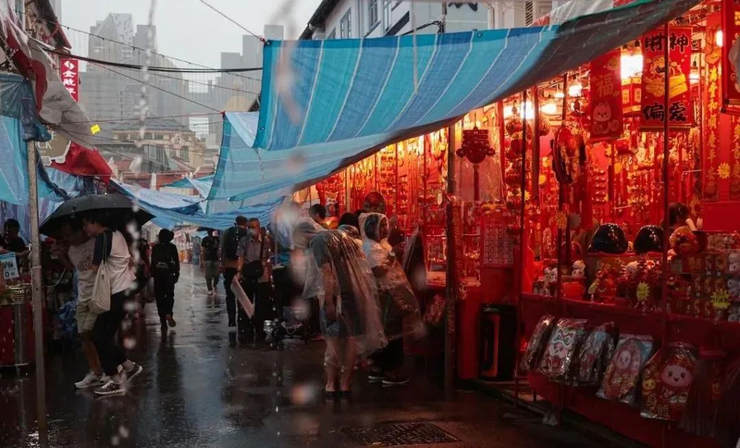 但春节采购的气氛仍然浓烈,可以看到大雨也阻挡不了市民们穿着雨披前来选购年货的热情。