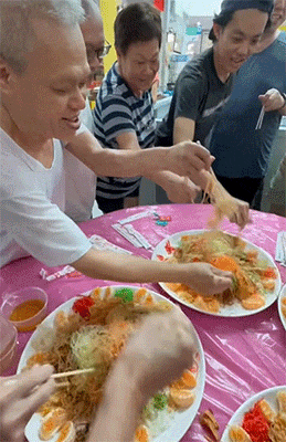 视频中小贩中心的居民们欢聚在一起分享年货,并高高将盘中的鱼生捞起,现场气氛一片热闹喜悦!