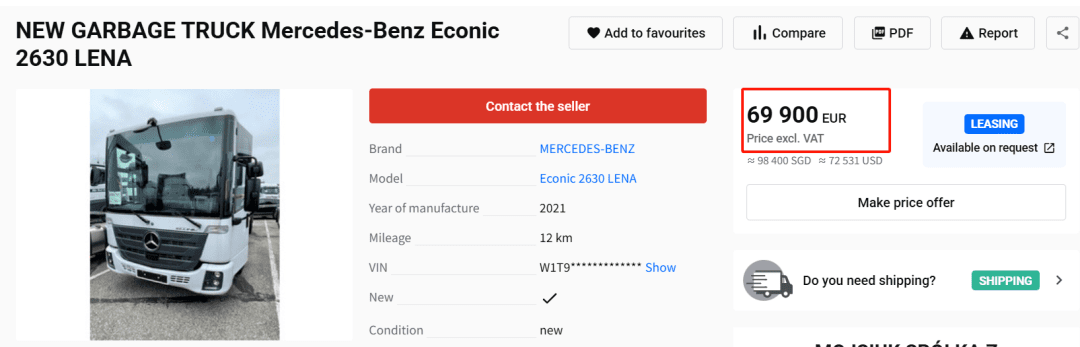 根据网上能够搜到的信息,垃圾车的类似款报价是69900欧元(现在汇率算大约98300新币)。