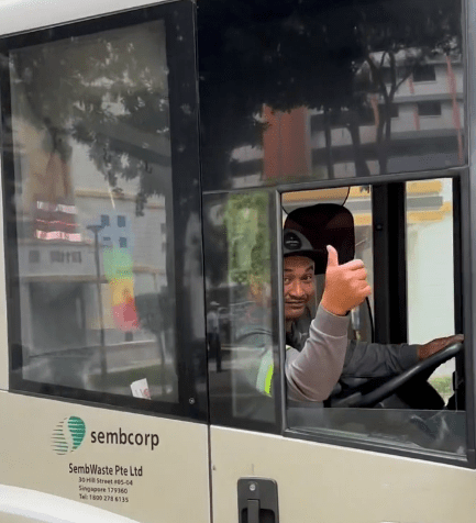 网友po出的视频显示,一辆胜科集团下的垃圾车在新加坡的一个组屋区行驶。刚好经过垃圾车正面的这名网友,立即就被奔驰标志给吸引住了。