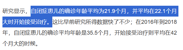 自闭症患儿的确诊年龄平均为21.9个月(1岁零9.9个月),并平均在22.1个月大时(1岁零10.1个月)开始接受治疗。