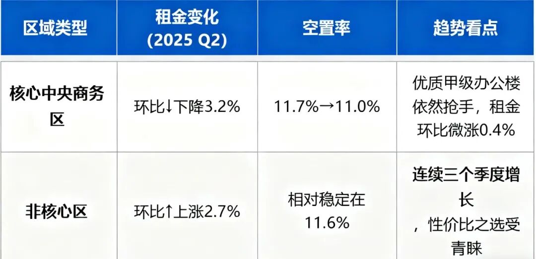 核心中央商务区的优质甲级办公楼虽然租金较高,但空置率低,未来租金可能有上涨压力,更适合预算充足的企业。