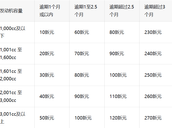 如果你的车辆车龄超过10年,你还需支付年度路税附加费,该费用会加在您的总路税账单上。沿用上面的例子,如果这辆丰田卡罗拉车龄超过10年但未满11年,车主每年需支付104新元的附加费。如果车龄达到14年及以上,年度附加费将升至512新元。