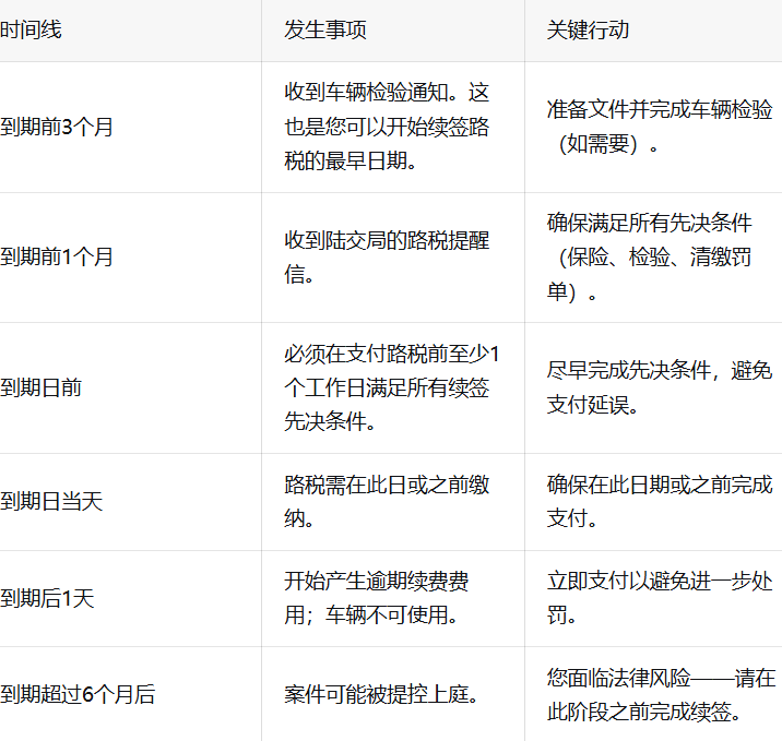 逾期支付路税,您将被收取逾期续费费用,具体金额根据您的车辆类型和逾期时间而定。