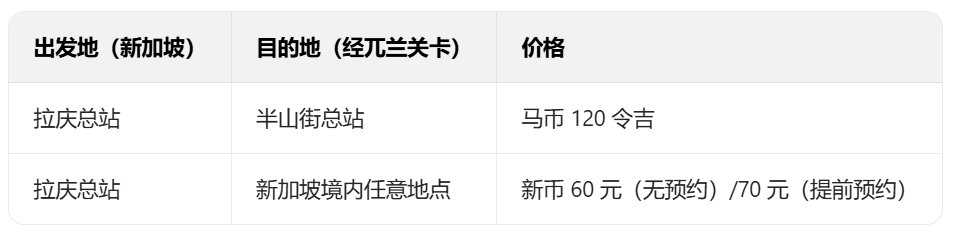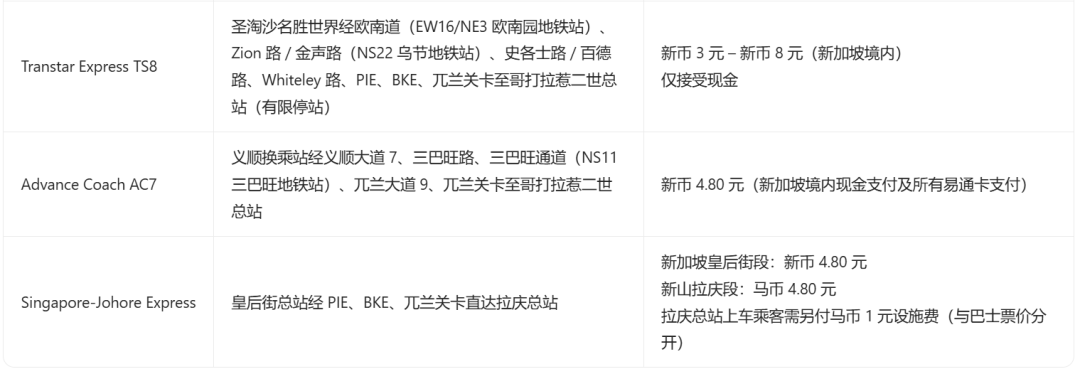 票价规则:分两类,一类是常规里程计费的干线票价(如 SBS、SMRT 线路,从克兰芝 / 兀兰地铁站到新山关卡成人 1.50 新元)、另一类是固定区间票价(如 Transtar、Advance Coach 等线路,新加坡境内 3 - 11 新元不等,部分仅收现金,Advance Coach AC7 支持易通卡支付、Singapore-Johore Express 分新加坡段和新山段票价,且需另付设施费)。