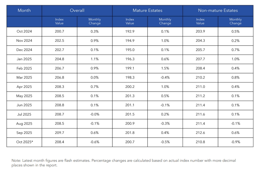 在不同房型中,三房式和五房式组屋录得0.3%的温和增长,显示了来自"户型优化"家庭和寻求更大生活空间买家的持续需求。相比之下,四房式组屋价格下跌1.3%,而公寓式组屋的价格则与9月持平。