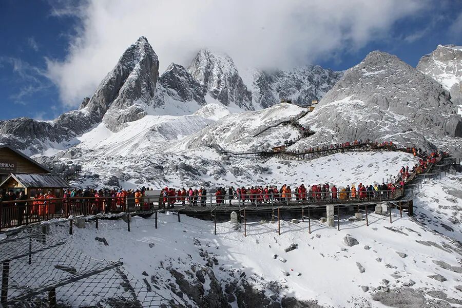 玉龙雪山(海拔 5596 米)冬季壮观,13 座雪峰形似玉龙,可乘巴士赏蓝月谷清透湖水,缆车直达冰川公园或牦牛草甸,需备便携氧气。