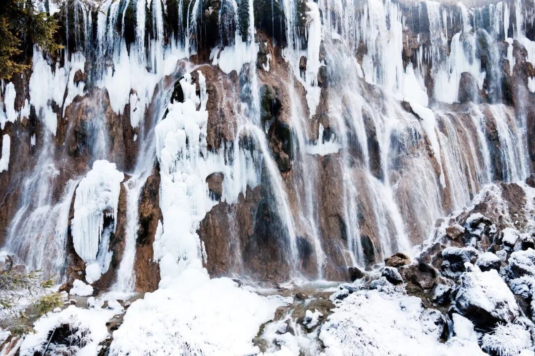 12 月至 2 月的九寨沟国家级自然保护区,白雪覆盖瀑布、湖泊,化作绝美冬日仙境,是网红打卡胜地。