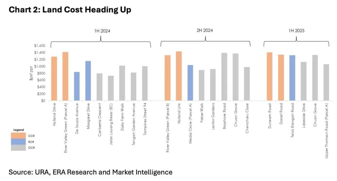 2025年土地成本显著上升,璧山湾、川园等地块刷新OCR地区价格纪录。未售库存持续下降,开发商补货需求迫切,加之《2025发展总蓝图》释放新兴住宅区机遇,土地成本已成为支撑房价的关键因素。
