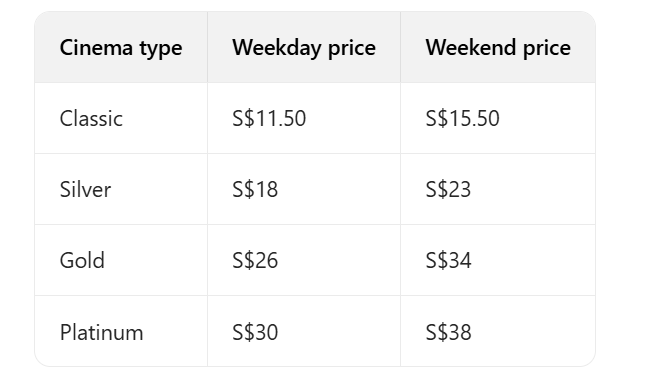GV Movie票价略高于 Shaw,工作日普通票 S$11.50–S$12,周末 S$16,不过它凭借丰富的影院类型,主打更高端的观影体验,以此形成差异化优势。