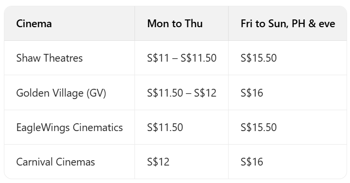 周末 Shaw 与 EagleWings 同价(S$15.50),SAFRA MovieMax、汇丰卡可享S$9.50 低价。
