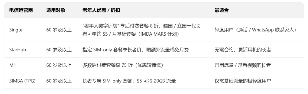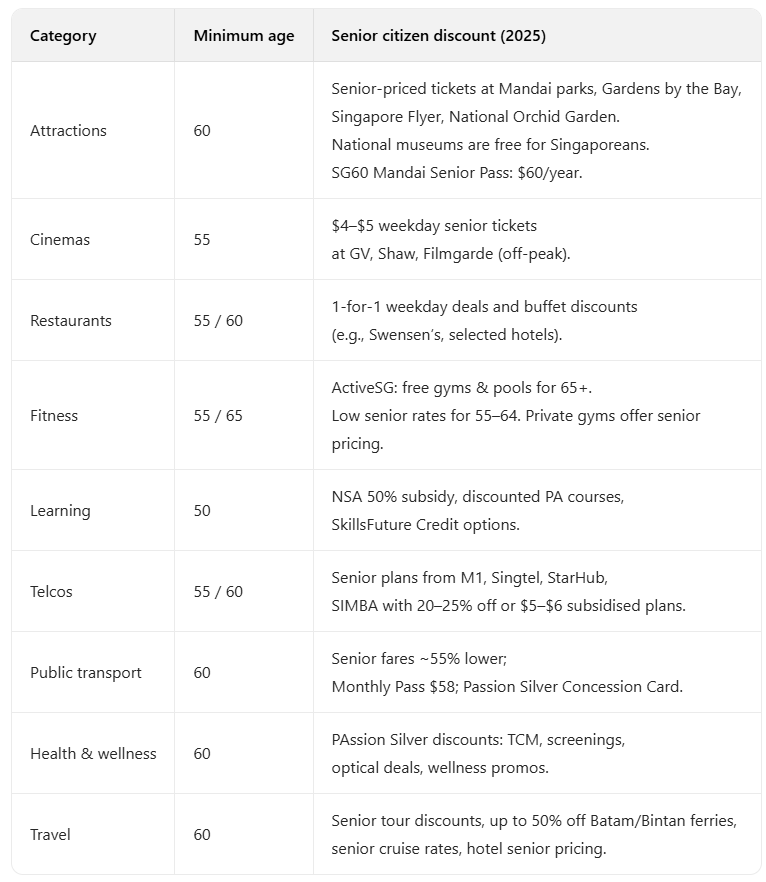 以下是2025年新加坡老年人折扣与福利