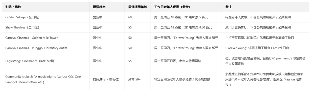 Golden Village(all outlets)60 岁 + 午后 6 点前 2D 票 5 新元,Carnival Cinemas – Golden Mile Tower 55 岁 + 日间票 4.50 新元等有专属优惠。