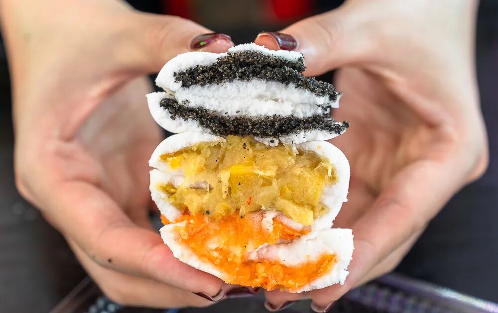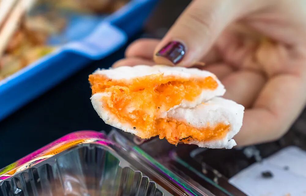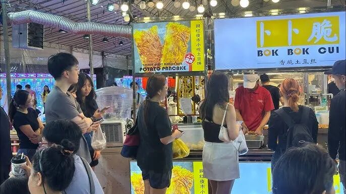入口处的Bok Bok Cui摊位傍晚 6 点就排起长队,招牌Potato Pancake仅 3 新元一份,巴掌大小,现煎出锅热气腾腾,双面酥脆裹满香辣调料,入口即化,美味十足。