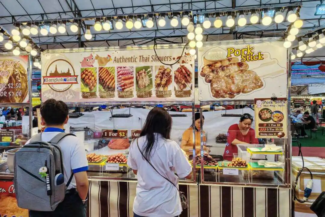 泰式烧烤摊Bangkok Grill很对泰餐爱好者胃口,Moo Ping、鸡肉串等烤串任选,2 新元 / 串或 3 串 5.50 新元,搭配 1 新元的糯米饭超赞,Moo Ping肉香浓郁,鸡肉串虽稍显普通,但焦香均匀也值得一试。