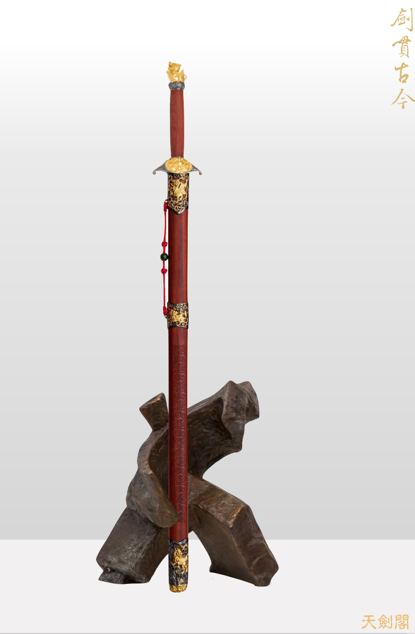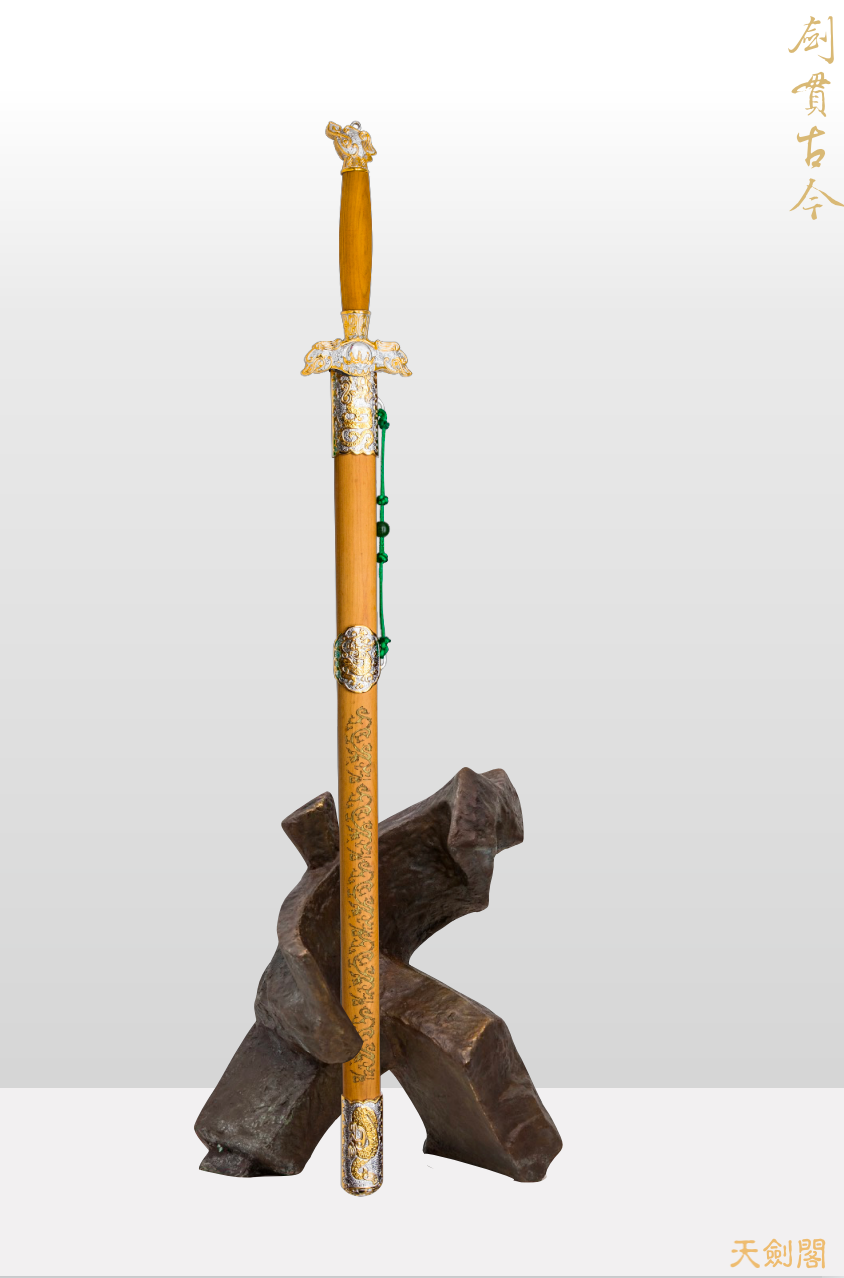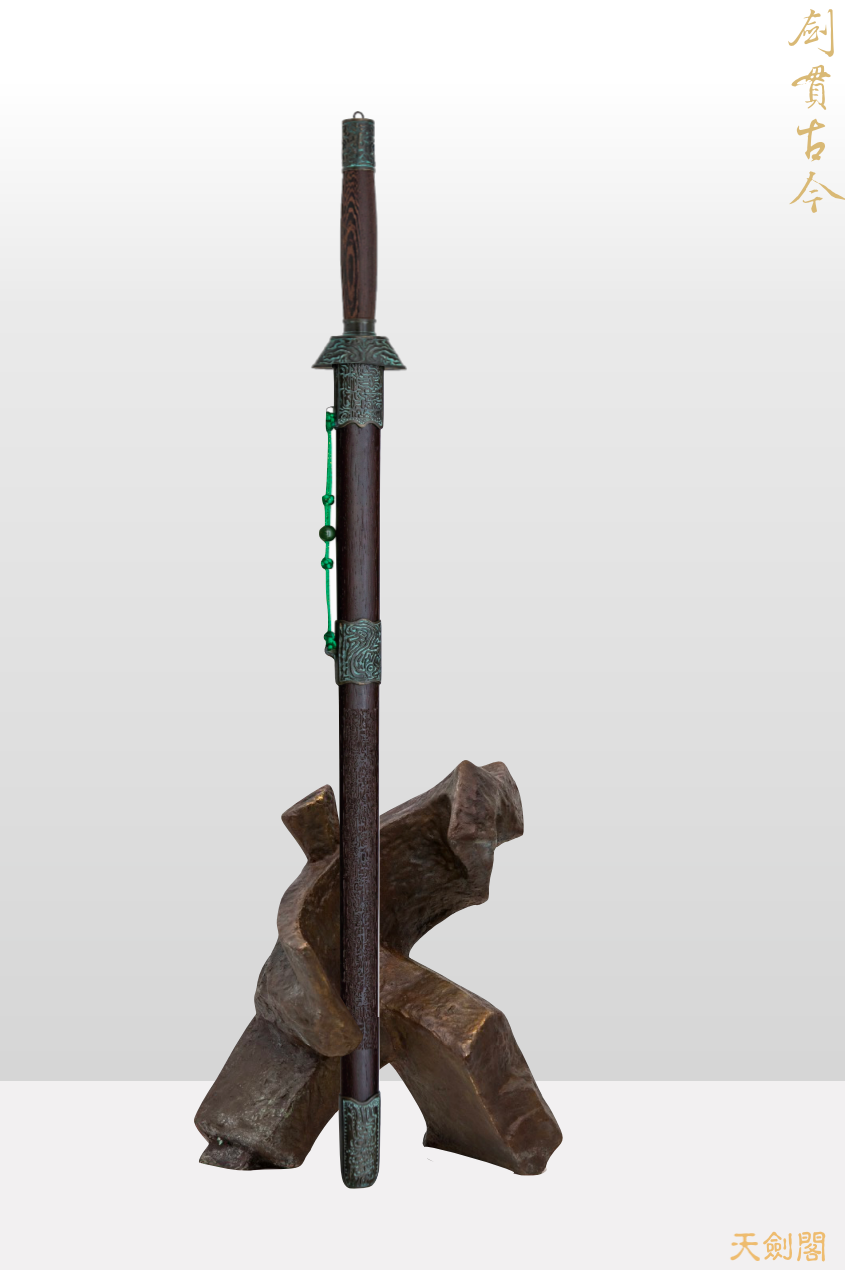 【辟邪】晋•崔豹《古今注》: 「三国吴大帝孙权有六柄宝剑:一曰白虹、二曰紫电、 三曰辟邪、四曰流星、五曰青冥、六曰百里。」辟邪,为古代传说中的瑞兽。形象似狮而带双翼。古代军旗、盾牌常用辟邪图案,借以辟 邪除灾。自古以来,即常有宝剑辟邪的传说。配戴出行,居家镇宅,皆有异闻。宝剑易于通传灵气,甚至有认主之说。更进一步,就是飞剑、剑仙之类的传闻了。直而光净,寄神念而不偏 斜。养之而无害。