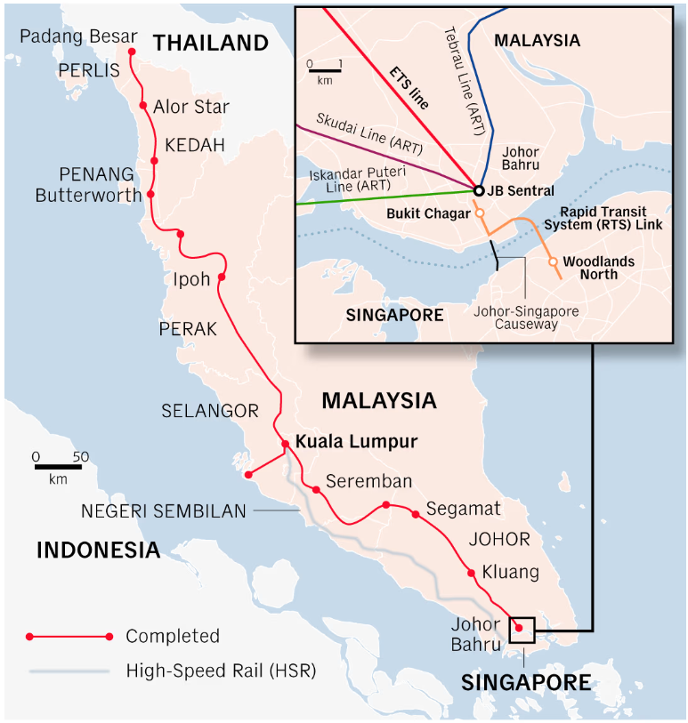 JB Sentral、Kulai、Kluang、Segamat、Gemas、Seremban、Kajang、Bandar Tasik Selatan、KL Sentral(全线共 18 个站)