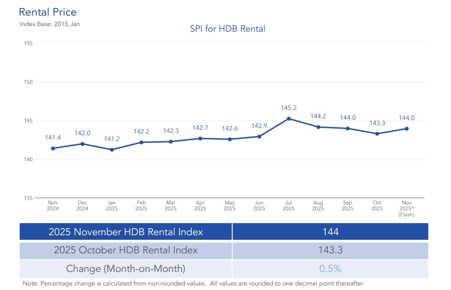 另一方面,虽然组屋转售市场并没有完全降温,但租金指数在2025年11月环比上涨0.5%,扭转了连续三个月的价格下跌趋势。