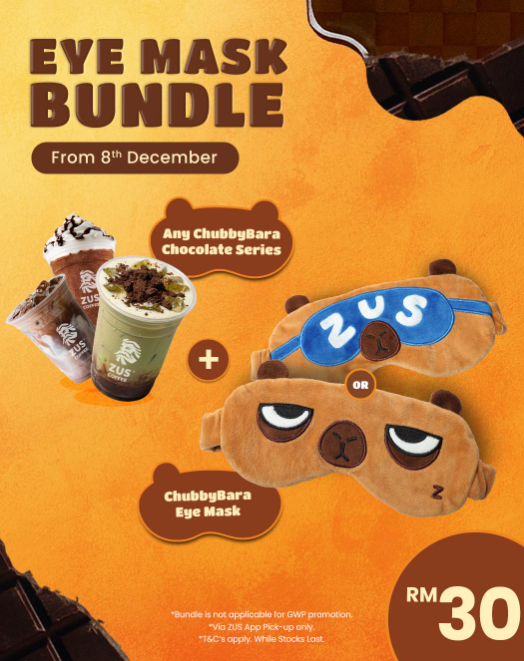 ZUS Coffee 年末推出暖心活动:12 月 1 日起有 Chocolate ChubbyBara 系列,指定饮品搭配眼罩套餐 30 新元、12 月 8 日起,APP 点手工饮品满 28 新元,免费得 ChubbyBara 毛绒气囊支架,还有多款新品饮品。