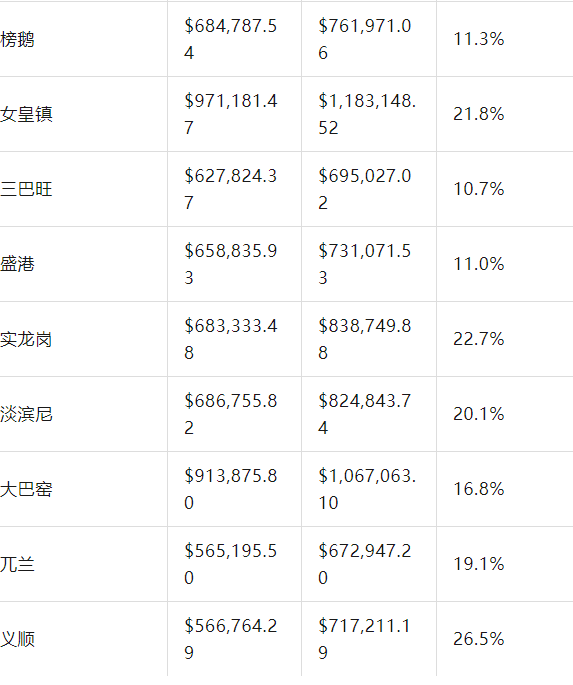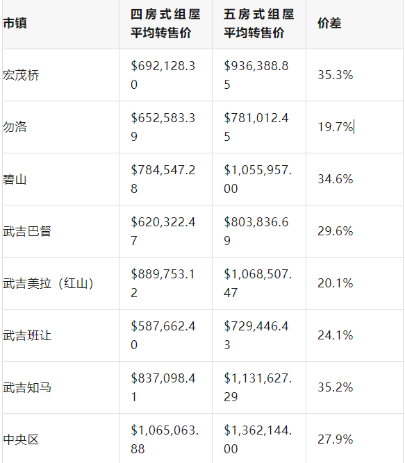 以下是今年新加坡各市镇四房式与五房式组屋平均转售价及价差表: