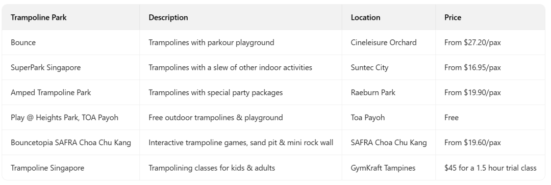 - 在新加坡,Trampoline 蹦床成为了一种既有趣又有益健康的活动,适合遛娃。