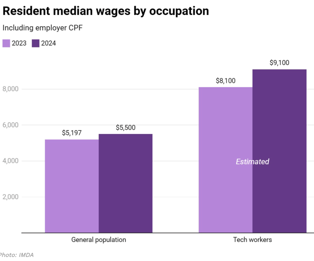 根据新加坡资讯通信媒体发展局(IMDA)的最新数据(2025发布),新加坡科技专业人士的月薪中位数已经超过9,000新元(包括雇主缴纳的CPF)!