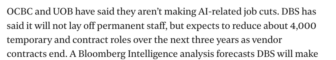 星展银行(DBS)表示不会裁减正式员工,但预计未来三年内,随着供应商合同的到期,将减少约4000个临时工和合同工岗位。