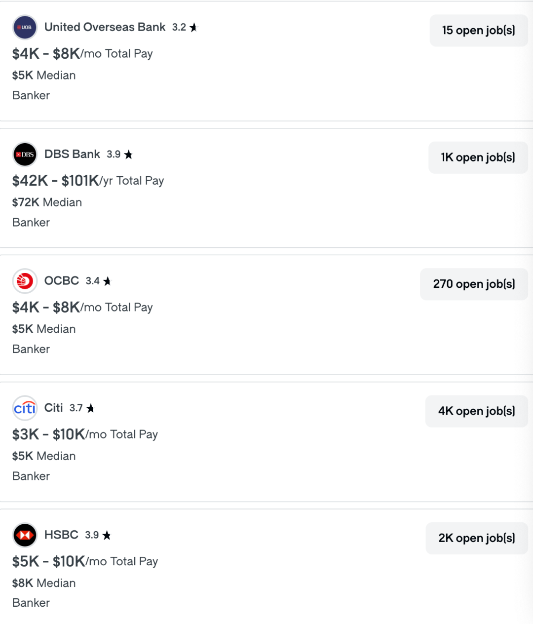图源:glassdoor |本地各银行的招聘薪资范畴