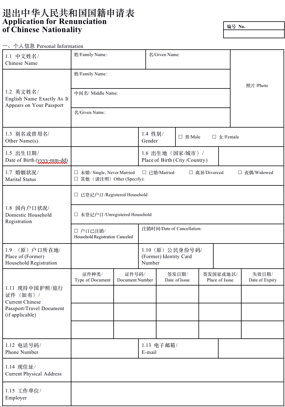 填妥的《退出中华人民共和国国籍申请表》2份。