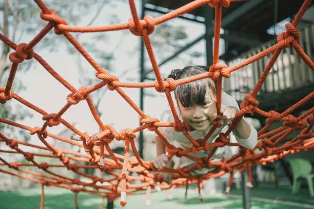 三层交错的安全网遮蔽式游乐场是孩子的欢乐天地,配备渔网、绳桥和滑梯,两侧设防攀爬保护网,能避免孩子意外跌落,家长记得提醒孩子穿鞋子而非拖鞋哦。