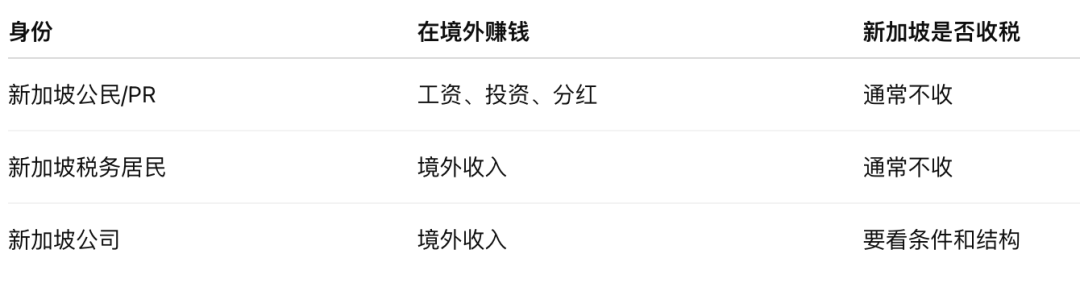 新加坡:看“钱从哪来” → 只要不是新加坡来源收入,原则上不收税