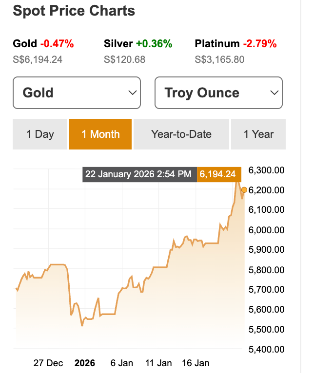 现在,黄金现货价在周内一度逼近 4887.82 美元/盎司(即6300 新元/盎司)。