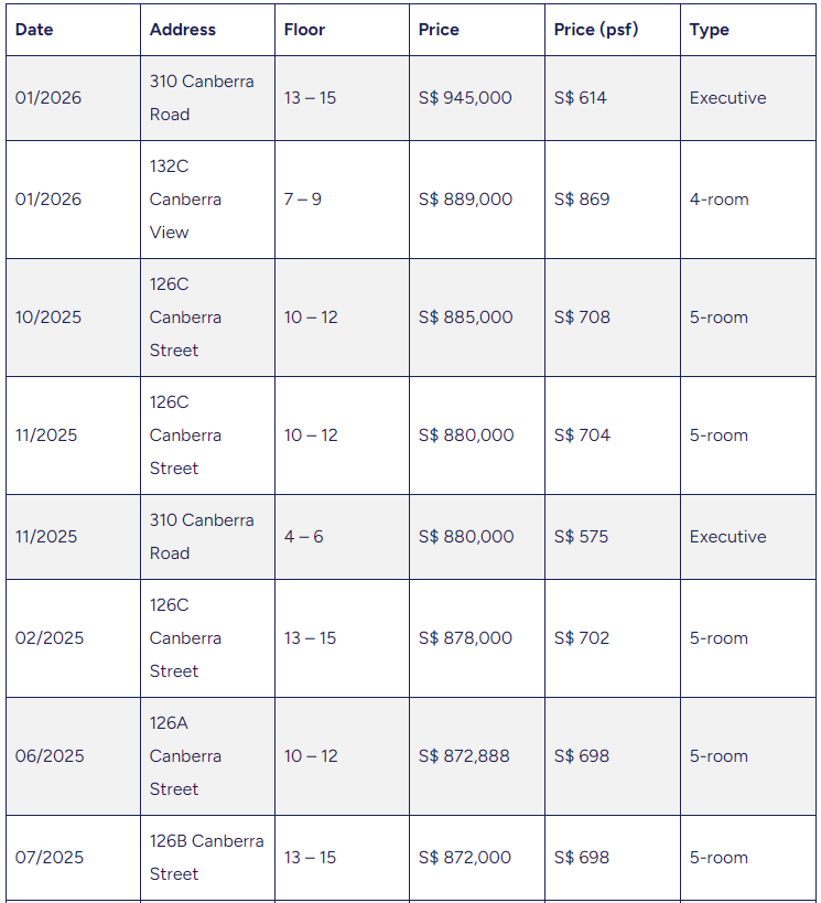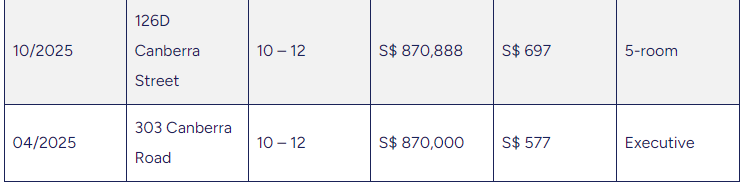 除了94.5万新元的交易,过去一年大多数高端交易价格区间非常集中,往往仅相差几千新元。堪培拉路和堪培拉街的数套五房式和公寓式单位成交价大致在87万至88.5万新元之间,表明价格呈逐步、平稳上升态势,而非急剧飙升。作为参考,2025年三巴旺公寓式组屋的平均价格约为74.7万新元,这突显出最新交易远超整体市场水平。