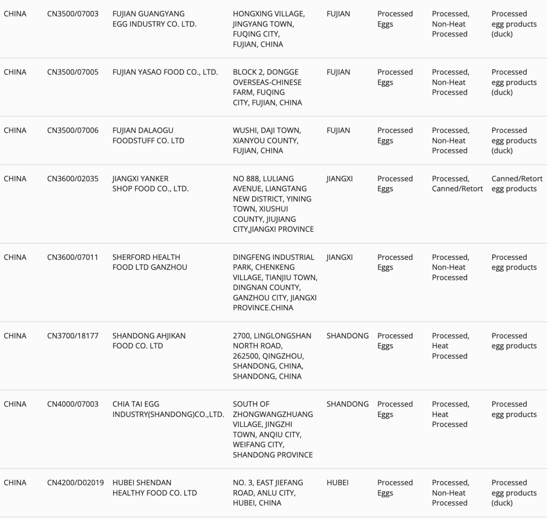 其中鸡蛋和蛋制品,累计有资质的企业只有32家。获批准进口省市包括北京、辽宁、吉林、江苏、福建、湖北、江西、广东等。