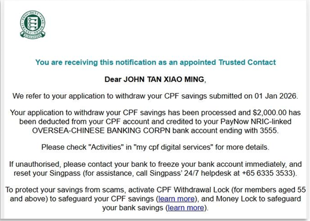 这样做的目的是让我们信任的人(例如家庭成员)能在注意到任何我们可能错过的可疑活动时,有能力提醒我们。例如,当你从公积金提款时,信任联系人将收到如下通知: