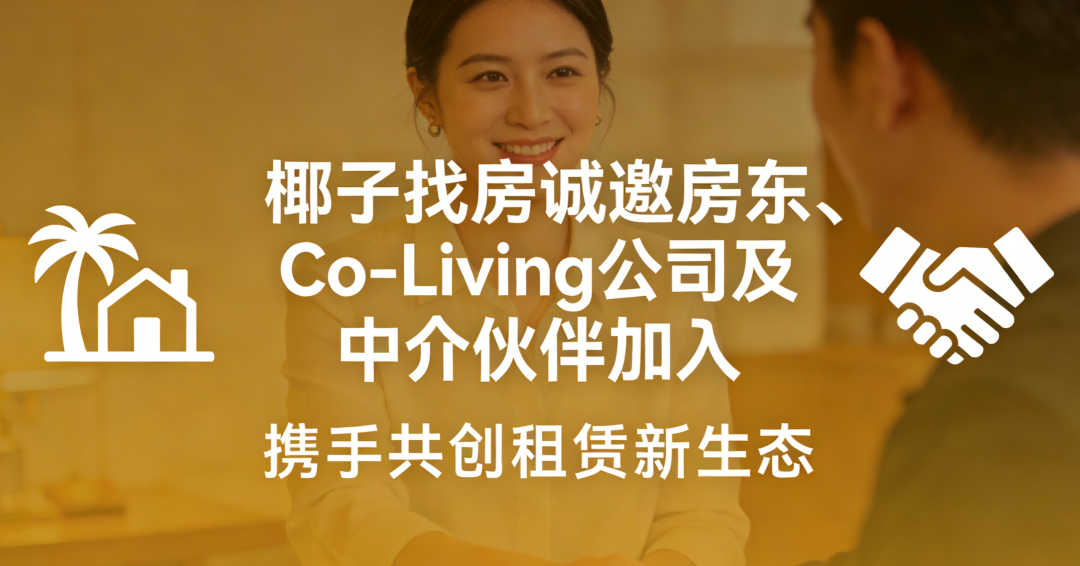 椰子找房诚邀手握优质房源的第一手房东、专业Co-Living公司及中介伙伴加入,以专业平台为您精准匹配租客、保障合规收益,共同开拓新加坡稳健租赁市场。欢迎加入。