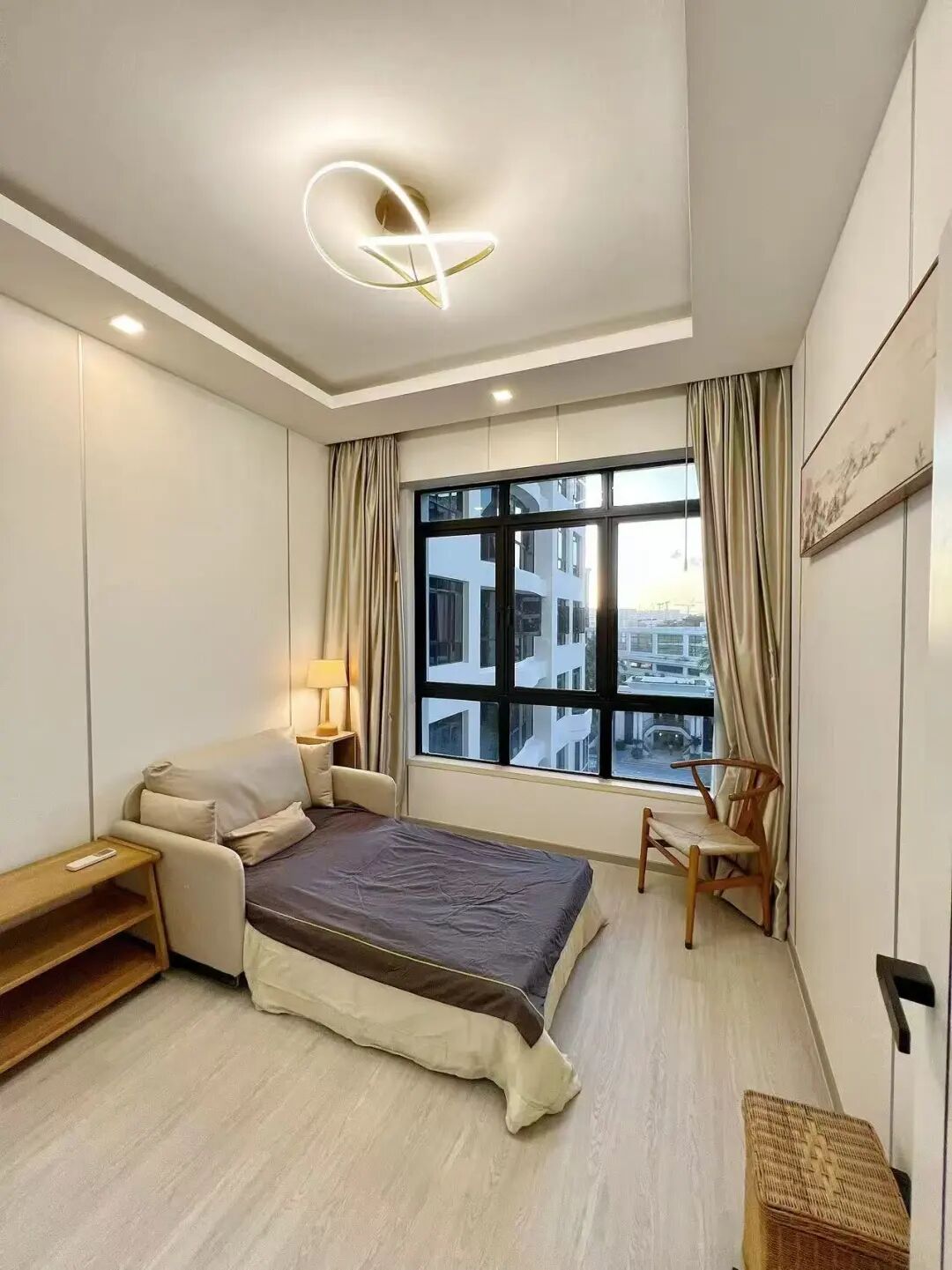 房间带大窗户,望出去是绿景,采光好不压抑。