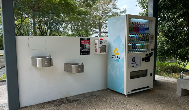 新加坡武吉甘柏公园从 Whisk & Paddle 餐厅往上的半山腰,设有带遮蔽休息区,配备饮水机与自动售货机,同时还有 Gym Pod 智能健身舱,为游客提供休息、补给与健身的便利设施。