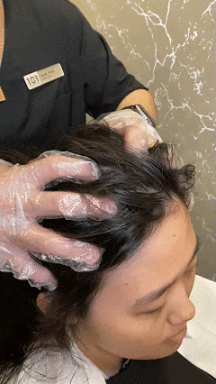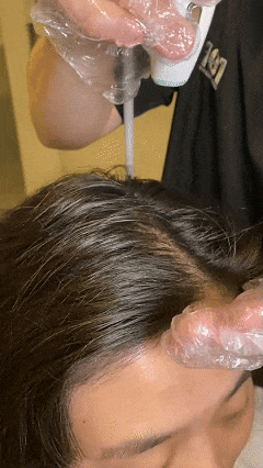 用专业喷雾仪器将定制化安瓶精华打成细腻水雾,均匀覆盖整个头皮,像是给头皮裹上了一层营养保护膜。
