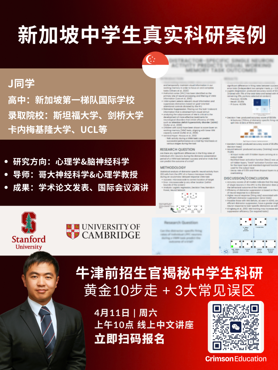 4月11日周六早上10点,拥有7年以上本科升学辅导经验牛津大学前招生官的Patrick,将首次公开新加坡中学生科研路线图!