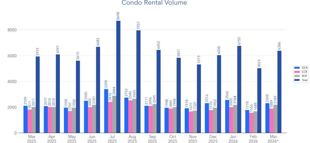 同比来看,租赁量比2025年3月高出7.7%。此外,当月的成交量比五年平均水平高出8%,这表明整体租赁活动仍然相对强劲。