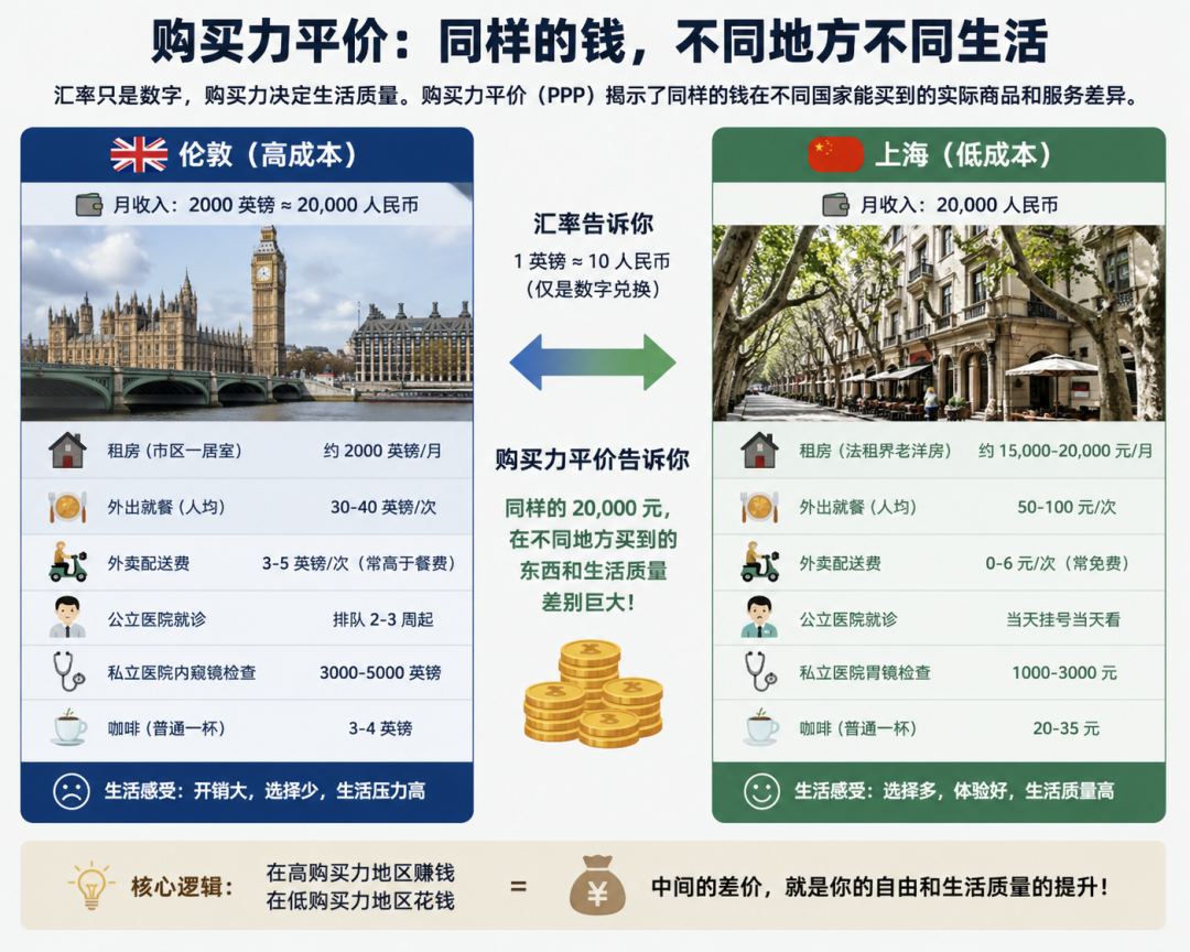 汇率只是账面上的兑换比例,但真正决定你生活质量的,是“同样的钱,在不同地方能买到什么”。